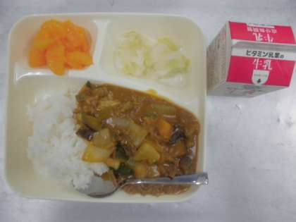 今日の給食のメニューは、夏野菜のカレーライス、キャベツのサラダ、缶みかん、牛乳、でした。にんにくと一緒に牛肉やセロリが香りよく炒められていました。その他の具材にはかぼちゃ、たまねぎ、なす、トマト、ピーマンが入っていて、ちょうどよいとろみぐあいのカレールーにやさしく包み込まれていました。キャベツのサラダはワインビネガーと薄口しょうゆでさっぱりとした味にととのえられていました。缶みかんは子どもたちも大好きです。