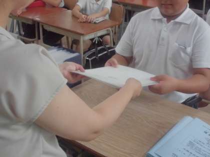 教室では担任の先生から通知表を渡してもらいました。1学期のがんばりと成長が記されています。少し照れくさそうにしながら、受け取っている子どもたちのようすが印象的でした。さあ、中身はどうだったかな?