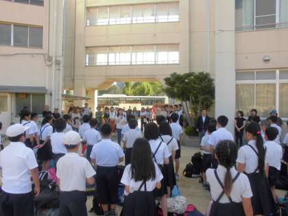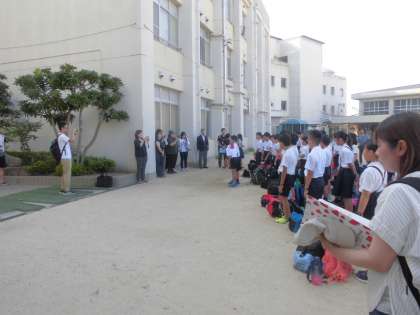 5年生の子どもたちが今日から3日間、林間学習に出かけました。兵庫県のハチ高原で大自然の中で元気いっぱいに過ごしてきます。友だちとの絆を深めながら、たくさんの思い出を作って帰ってきてほしいですね。出発式では校長先生の話や児童代表のあいさつがありました。またたくさんの保護者の方々のお見送りもあり、子どもたちもこれからはじまる3日間に胸をはずませていました。