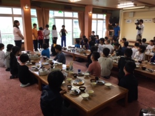 林間学習二日目です。今日は朝から小雨が降っています。朝の会が終わり、これから朝食です。しっかりエネルギーを蓄えて、今日一日を頑張りましょう。