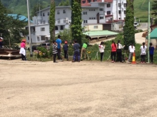 スイカが全員に配られました。とても美味しそうに食べています。草むらに向かって種とばしで遊んでいます。