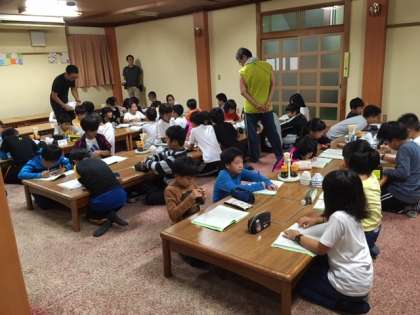 室内オリンピックが終わってナイトハイクも無事終了しました。班会議で今日の一日の反省をしました。この後、消灯・就寝です。