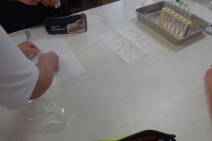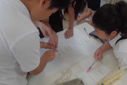 6年生が理科の授業でリトマス紙を使って、いろいろな水溶液について調べていました。赤色と青色のリトマス紙の色の変化で水溶液を仲間分けする実験です。食塩水、炭酸水、石灰水、薄い水酸化ナトリウム水溶液、薄い塩酸などについて調べ、各グループで表にしていました。友だちと協力しながら作業を進めることができていました。