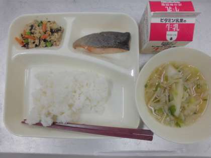 今日の給食のメニューは、さけの醤油風味焼き、五目汁、高野豆腐のいり煮、牛乳、ごはん、でした。さけの醤油風味焼きは切り身が厚く大きめでした。皮はパリッと焼かれていて身はやわらかかったです。五目汁はだしがしっかりととられていて、でも濃すぎずあっさりとしていて飲みやすかったです。高野豆腐のいり煮は高野豆腐のほかに豚挽肉、にんじん、ひじき、グリンピースが入っていて少し甘めの味つけで、ごはんにもよく合いました。