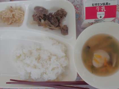 今日の給食のメニューは、プルコギ、トックスープ、もやしの甘酢和え、牛乳、ごはん、でした。プルコギは牛肉がにんにくと生姜で香りよく炒められていて、コチジャンをメインとした手作りダレがしっかりと牛肉やピーマン、たまねぎとからんでとてもおいしかったです。ごはんとの相性もばっちりでした。トックスープはしいたけのもどし汁とニラに風味が味に深みを与えていました。韓国のおもち「トック」が入っていて、日本のおもちとはちがった食感が楽しめました。もやしの甘酢和えはさっぱりとした口あたりでした。