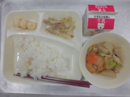 今日の給食のメニューは、鶏肉と里芋の煮物、豚肉とキャベツの炒め物、みたらしだんご、牛乳、ごはん、でした。鶏肉と里芋の煮物は里芋がやわらかくほっこりしていました。厚揚げや鶏肉、たまねぎなどに甘めの和風だしがしっかりとしみ込んでおいしかったです。豚肉とキャベツの炒め物は豚肉とキャベツが生姜と一緒に香りよく炒められていて、塩としょうゆで薄めに味つけられていました。みたらしだんごは甘くもちもちしていて子どもたちも大好きです。