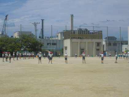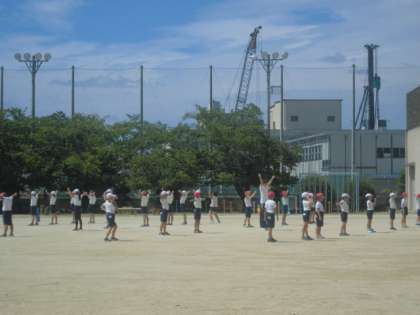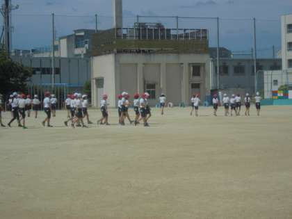 4年生が運動場で練習をしていました。水分補給をとりながら、自分の位置や移動の仕方を覚えていました。