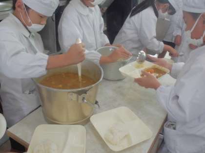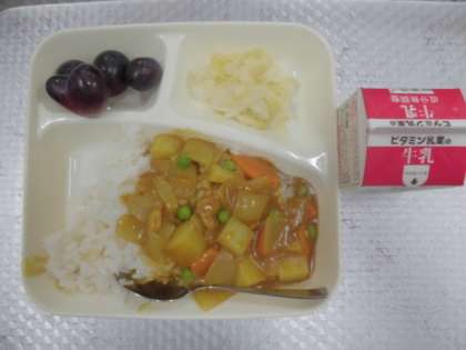 今日の給食のメニューは、チキンカレーライス、キャベツのピクルス、ぶどう、牛乳、でした。チキンカレーライスはじゃがいもやにんじん、たまねぎが食べやすい大きさにカットされていてやわらかく煮込まれていました。今日使用したカレールウは米粉でできているそうです。米粉ルウで作ったチキンカレーライスです。キャベツのピクルスはさっぱりとした口あたりでした。ぶどうは甘くておいしかったです。