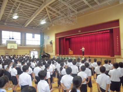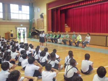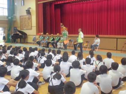 今日の児童集会では日頃子どもたちの登下校を見守っていただいている見守り隊の方々に来ていただいて、感謝の気持ちを伝える会を開きました。児童代表の感謝のことばやプレゼントをお渡ししました。また全校児童で「ありがとう」の歌を歌いました。見守り隊の方々にもとても喜んでいただきました。これからも子どもたちの安全を見守っていただきますようよろしくお願いいたします。
