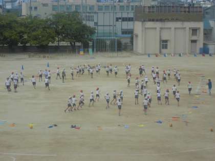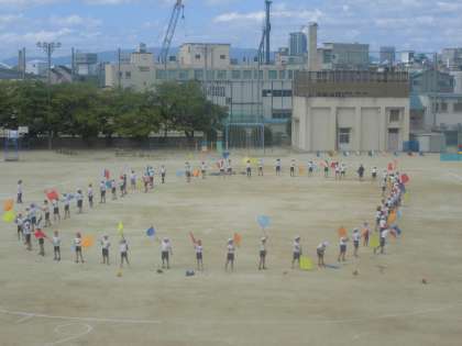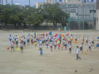 6年生がいよいよ運動場での練習を始めました。色とりどりのフラッグが鮮やかです。自分の場所や移動の仕方を確認していきます。暑いですが休憩をとりながら頑張っています。