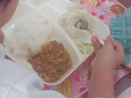 今日の給食のメニューは、大豆入りキーマカレーライス、グリーンサラダ、白桃、牛乳、でした。大豆入りキーマカレーライスは大豆がひきわりになっていて細かかったので、主張しすぎずに牛豚挽肉やたまねぎ、にんじんなどと馴染んでとても食べやすかったです。辛さもそれほど辛くなく、子どもたちもおいしそうに食べていました。グリーンサラダはキャベツときゅうりが塩ゆでされていて、ノンエッグドレッシングがついていました。白桃は缶詰ですが、甘くて子どもたちも喜んで食べていました。