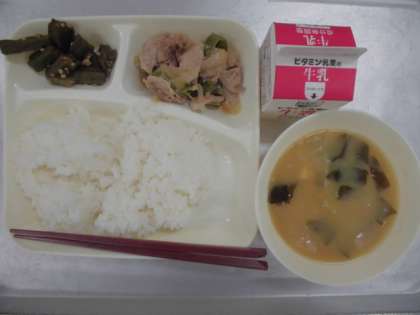 今日の給食のメニューは、豚肉の甘辛焼き、みそ汁、オクラのおかか炒め、牛乳、ごはん、でした。豚肉の甘辛焼きは生姜焼きのような感じで、たれが豚肉だけでなくたまねぎやピーマンにもしみ込んで、ごはんがすすみました。みそ汁はだしの香りがただよい、具だくさんでした。オクラのおかか炒めはかつおぶしの風味がアクセントになっていました。おいしかったです。