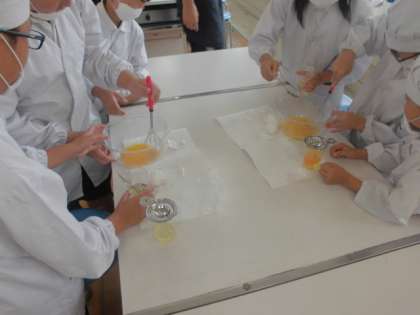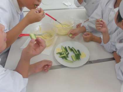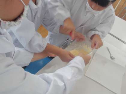 3年生の子どもたちにキューピーから出前授業に来ていただき、マヨネーズ作り体験を行いました。マヨネーズは何からできているのだろう???おもな原料は、植物油、黄身、酢、塩です。混ざることのない植物油と酢が黄身のおかげで乳化して混ざり合い、マヨネーズになります。さあ、マヨネーズ作りの始まり。子どもたちは手順を教えてもらって、一生懸命に混ぜていきます。「わぁ、マヨネーズみたいになってきたー。」・・・マヨネーズを作っています(^^)/最後はきゅうりにつけて・・・「めっちゃ、おいしいよ。」あっという間にきゅうりがなくなってしまいました。おいしかったです。
