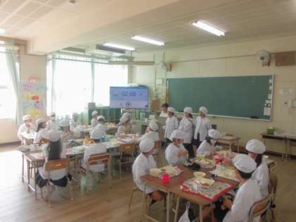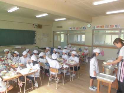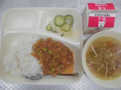 今日の給食のメニューは、タコライス、もずくと白ねぎのスープ、キャベツときゅうりのサラダ、牛乳、でした。タコライスはメキシコ料理のタコスが由来になっていて、沖縄県の郷土料理です。たっぷりの牛豚挽肉とたまねぎ、グリンピースが入った手作りのトマトベースのサルサソースをごはんにかけて食べます。カレーでもなくハヤシでもなく普段あまり口にしない味なので子どもたちも興味を持って食べていました。もずくと白ねぎのスープはあっさりとした味で、もずくのとろみが出ていました。キャベツときゅうりのサラダは軽く米酢が効いていました。おいしかったです。