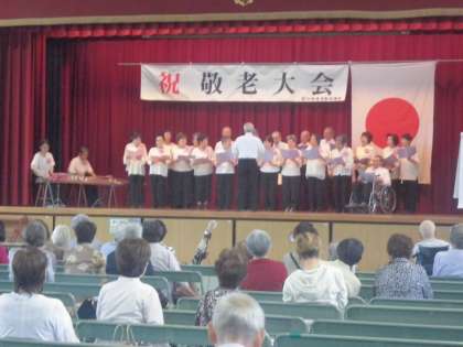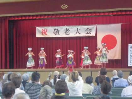 本日、淀川小学校講堂において淀川地域「敬老大会」が行われました。地域のたくさんの方々がご出席され、ご長寿とご健康をお祝いされました。第1部の式典では淀川中学校吹奏楽部の演奏で始まり、各来賓の方々の祝辞がありました。第2部の催し物では和太鼓や舞踊、フラダンス、コーラス、獅子舞などが披露されました。参加されたお年寄りの方々もとても喜んでおられました。地域のお年寄りの皆様、どうかお体に気をつけていただいて、いつまでも健康でお元気にお過ごしください。そして子どもたちの健やかな成長を見守っていただきますようよろしくお願いいたします。本日は誠におめでとうございます。
