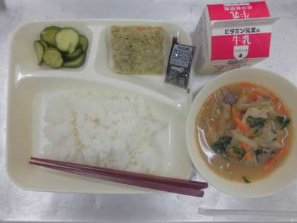 今日の給食のメニューは、お好み焼き、豚汁、きゅうりの甘酢和え、牛乳、ごはん、でした。お好み焼きは生地がやわらかく、山芋とろろが入っていてふんわり感がありました。ソースをかけて食べますが、かつおぶしと青のりの風味も強く感じられました。豚汁はだしがしっかりととられていて、豚肉の旨みがいかされていました。さつまいも、たまねぎ、ごぼう、にんじん、みつばが入っていました。きゅうりの甘酢和えはあっさりしていて口あたりがよかったです。