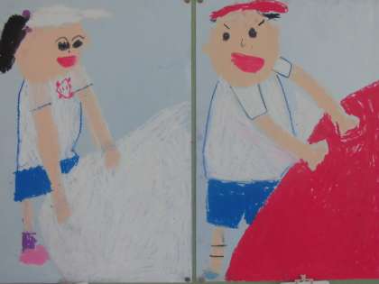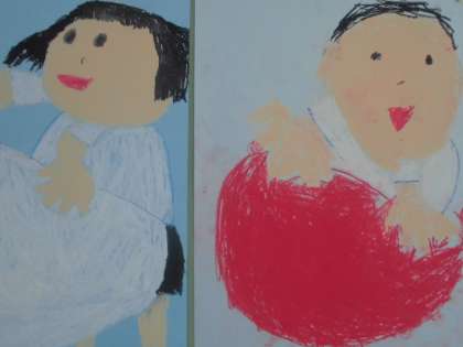1年生の教室の後ろでは、あかとしろの大玉が勢いよく転がっています。