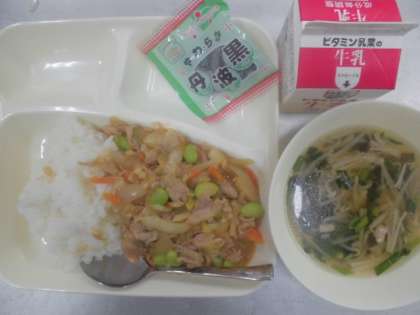 今日の給食のメニューは、ピリ辛丼、中華スープ、ソフト黒豆、牛乳、でした。ピリ辛丼は中華丼のような感じで、わずかにトウバンジャンでピリ辛感がありましたが、それほど辛くはなく食べやすくておいしかったです。具材もたっぷり入っていてボリューム感がありました。中華スープはにらの香りが効いていて、さっぱりとしていました。ソフト黒豆はやわらかくて甘く、デザートのようでした。