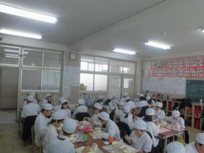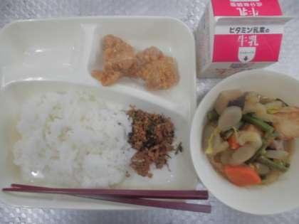 今日の給食のメニューは、鶏肉の竜田揚げ、厚揚げと野菜の煮物、おかか菜っ葉、牛乳、ごはん、でした。鶏肉の竜田揚げは生姜と料理酒、醤油で下味がつけられていて、ころももサクッと上手に揚げられていました。厚揚げと野菜の煮物はやさしい甘めの和風だしがベースでしいたけの香りが効いていました。ごぼうやにんじんもやわらかく煮られていて、厚揚げや白菜にも味がしっかりとしみ込んでいました。おかか菜っ葉は大根の葉とかつおぶしが一緒に炒められていました。ごはんにかけるとおいしかったです。