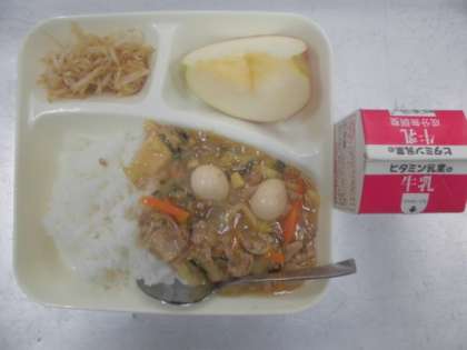 今日の給食のメニューは、中華丼、もやしの中華和え、りんご、牛乳、でした。中華丼は濃いめの味つけでほどよいとろみがついたあんが具材をつつみこんでいて、ごはんにかけるととてもおいしかったです。豚肉、うずら卵、たまねぎ、白菜、たけのこ、にんじん、にらが入っていました。もやしの中華和えは米酢の酸味がほんのり感じられ、ごま油の香りが効いていました。りんごもおいしかったです。