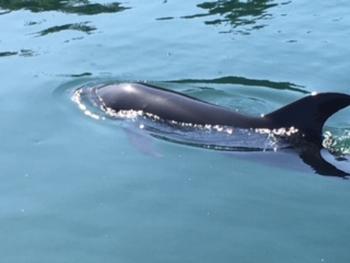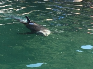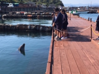 昼食場所のじゃのひれアウトドアリゾートに到着しました。まず、ドルフィンファームで、イルカを見学しました。