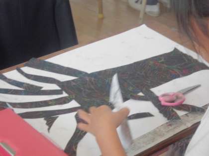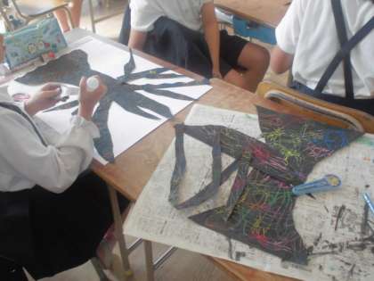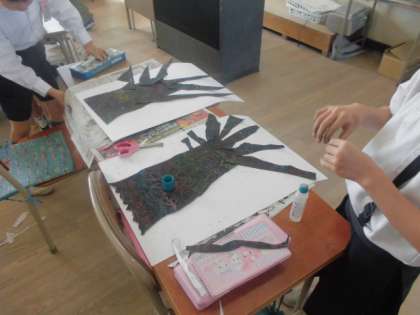 以前、2年生の図画工作の授業で取り組んでいた「めっちゃきれいー」と言いながら作っていた絵が、実は今日はこんなふうに変わっていました。幹の部分や枝の部分に切りとってのりで貼っていき大きな木になっていました。一人一人個性的な木ができあがっていました。このあと、さらにどんなふうに変わっていくのかな?
