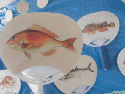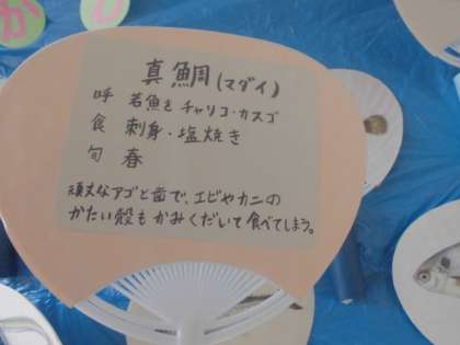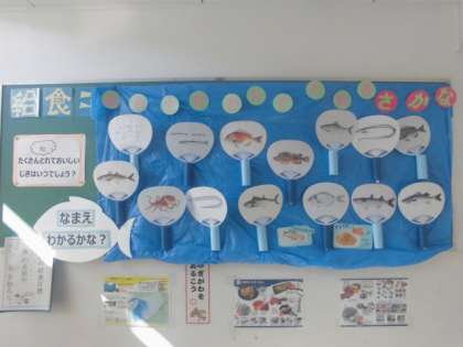 今月の給食目標は「魚の名前や旬を知ろう」です。給食ニュース掲示板には「大阪湾でとれる魚」が紹介してあります。うちわに魚の絵が貼ってあり、裏にはその魚の名前と説明が書いてあります。子どもたちがクイズ形式で手に取って楽しめる工夫ですね。毎月栄養教諭が工夫をこらした栄養や食育にまつわるテーマで掲示物を作成しています。子どもたちも楽しみにしているコーナーです。それにしても大阪湾でもたくさんの魚が取れるんですね。きっと他にもたくさんの種類があると思います。