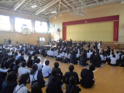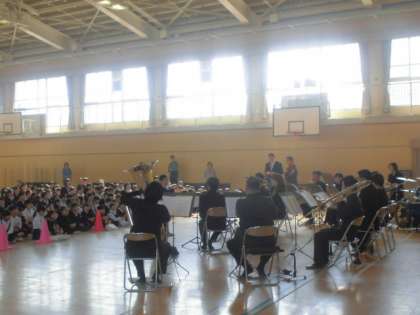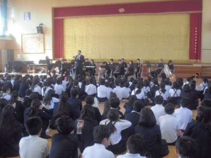 本日は午前中に吹奏楽団の方々に来ていただき、講堂で音楽鑑賞会を行いました。音楽鑑賞会は芸術に親しみ豊かな情操を養うこと、マナーを守り静かに楽しく鑑賞する態度を育てることをねらいとして行っています。クラシックから子どもたちに馴染のある曲までいろいろな演奏を聴いたり楽器体験などもさせてもらったりしました。迫力ある演奏やきれいな音色に子どもたちもどんどん引き込まれていくようすでした。