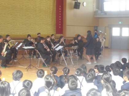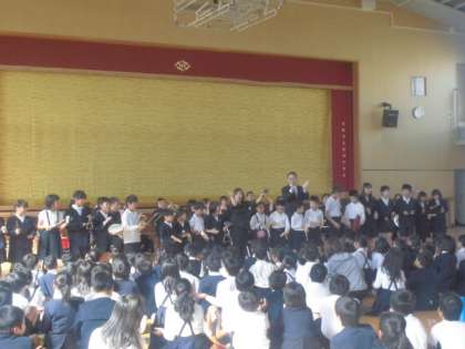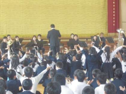 指揮者を体験させてもらいました。体験した子からは「緊張した。」「楽しかった。」「指揮者は大切な役割だと思った。」などの感想が聞かれました。楽器をもって楽団の方々とセッションも行いました。パプリカの曲が流れるとみんな自然と踊り出しました。みんなで一緒に歌も歌いました。歓声がたくさんわきおこり、拍手もいっぱいでした。子どもたちは楽しいひとときを過ごすことができました。