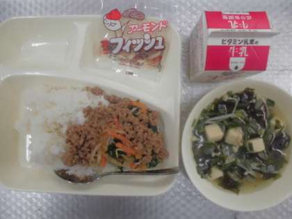 今日の給食のメニューは、ビビンバ、わかめスープ、アーモンドフィッシュ、牛乳、でした。ビビンバは大根、ほうれん草、もやし、にんじんがていねいに刻まれていて、牛豚挽肉と一緒ににんにくとごま油で香りよく炒められていました。しょうゆやコチジャンなどで味がしっかりとつけられていて、ごはんと合わせるとばっちりでした。わかめスープはあっさりとした薄めの中華スープをベースにわかめととうふがたっぷりと入っていました。にらの風味もほどよく感じられておいしかったです。アーモンドフィッシュはアーモンドの方が人気があるみたいです。