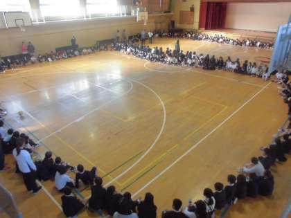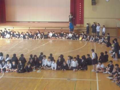 今日は講堂で児童集会がありました。みんなで「ボールばくだんゲーム」をしました。音楽が流れている間はどんどんとなりにボールを回してしきます。大きな円でしているので、ボールもたくさん回っていきます。音楽がストップしたときにボールをもっていた人が「今日のキラキラさん」です。今日のキラキラさんにはインタビューがされます。たくさんの「今日のキラキラさん」が誕生していました。