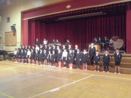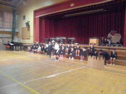 4年生が講堂で学習発表会に向けて練習をしていました。音楽劇のようです。題材は国語でも学習した「ごんぎつね」です。登場人物の心情を動作をしながらセリフや歌、楽器などで表現していきます。まだまだ練習段階ですが、なかなか雰囲気が出ていて上手でした。