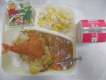 今日の給食のメニューは、エビフライカレーライス、カリフラワーのピクルス、豆こんぶ、牛乳、でした。エビフライカレーライスはまろやかでコクのあるカレールウの中に牛肉や食べやすい大きさにカットされたじゃがいもやにんじんなどがたくさん入っていました。辛さも少なく、子どもに食べやすいい味でした。エビフライはころもはサクッと揚げられていて身はぷりぷりしていました。カリフラワーのピクルスはワインビネガーの酸味とコーンの甘さが際立って、さっぱりしていておいしかったです。豆こんぶはこんぶの方が人気がありそうです。