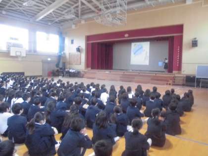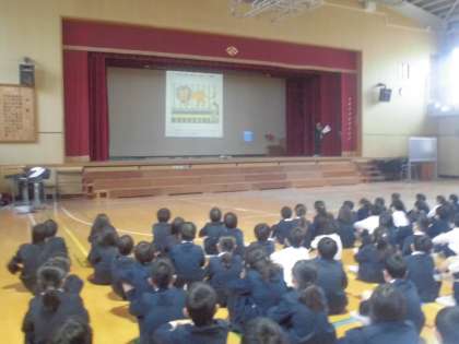 今日の児童集会は図書委員会の発表でした。はじめに図書委員会の活動について報告がありました。「休み時間に本の貸し出しや絵本の読み聞かせなどを行っているのでぜひ図書室に来てください。」続いてプロジェクターで絵本を映しながら、絵本の読み聞かせをしてくれました。おもしろい内容の本だったので、みんなクスクス笑いながら楽しむことができました。