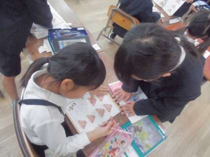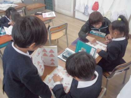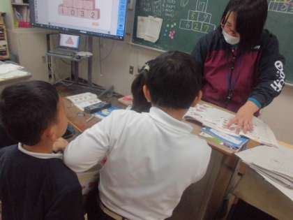 1年生が算数の授業で「けいさんピラミッド」という問題に取り組んでいました。たしたりひいたりしながらピラミッドの空いているマス目を埋めていきます。そこで1年生の子どもたちの中でも進んで教え合う姿が見られました。「こうするんだよ。」「ここがまちがってるよ。」…。できたら先生にまるをつけてもらいます。ずいぶんと1年生もしっかりとしてきましたね。