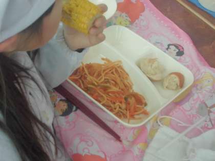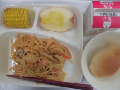 今日の給食のメニューは、きのこのスパゲッティ、焼きとうもろこし、りんご、牛乳、パン、でした。きのこのスパゲッティはケチャップ味のナポリタンのようでした。きのこの食感も楽しめました。日本には食べられるきのこは約100種類あるそうです。給食では7種類のきのこが出ます。えのきたけ、エリンギ、しいたけ、しめじ、なめこ、まいたけ、マッシュルーム。今日のスパゲッティにはエリンギ、しいたけ、しめじが入っていました。焼きとうもろこしは香ばしく焦げ目もあり、甘みが強くつぶも大きかったです。りんごはみずみずしくておいしかったです。