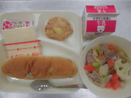 今日の給食のメニューは、豆腐ハンバーグ、カリフラワーのスープ煮、スライスチーズ、牛乳、パン、でした。豆腐ハンバーグは豆腐にツナとたまねぎをまぜ込んで、じゃがいもでんぷんと一緒にこねて形をととのえています。一つ一つ手作りで作っています。かなり手間がかかっています。ありがいたいですね。カリフラワーのスープ煮は洋風な仕上がりでコクもあり、味がしっかりとついていました。彩りも鮮やかで見た目にもきれいでした。スライスチーズは定番のものでした。