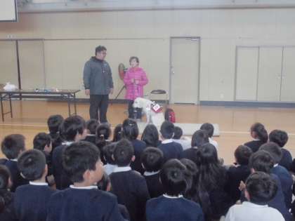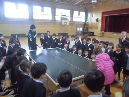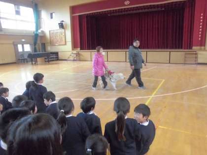盲導犬のフェリシアの働きの一部をデモンストレーションしてもらいました。とてもかしこくて子どもたちもびっくり、感嘆の声をあげていました。山本さんはいろんなスポーツにもチャレンジしてるそうです。身障者ルールの卓球やバレーボール、水泳やカヌー、スキーにもチャレンジているとのことでした。その様子のDVDも見せてもらって子どもたちも驚いていました。今日はその中で卓球を見せてもらいました。対戦した先生が負けてしまいました。