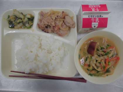 今日の給食のメニューは、豚肉の生姜焼き、さつまいものみそ汁、きくなと白菜のごま和え、牛乳、ごはん、でした。豚肉の生姜焼きは生姜の香りが効いていて、たまねぎにもだしがしっかりとしみ込みしんなりとしていました。豚肉もたっぷりでごはんと一緒に食べると、豚丼のようになりました。おいしかったです。さつまいものみそ汁は具だくさんで、さつまいもの甘さが広がっていました。きくなと白菜のごま和えは彩りもきれいで、お漬け物のような感じでした。