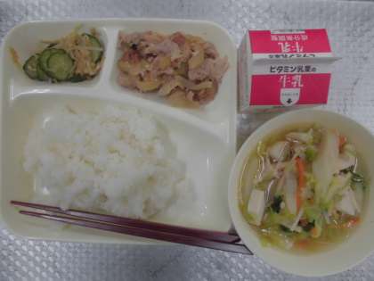 今日の給食のメニューは、焼き肉、五目汁、きゅうりともやしのおひたし、牛乳、ごはん、でした。焼き肉は豚肉とたまねぎがにんにく、みそ、しょうゆで香りよく炒められていて、ごはんがすすみました。五目汁はだしが効いた透明感のあるスープに細かく刻まれた野菜と鶏肉、かまぼこが入っていておいしくて飲みやすかったです。きゅうりともやしのおひたしはあっさりとしたしょうゆベースの味つけで中華風でした。