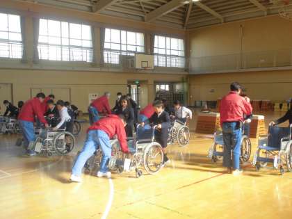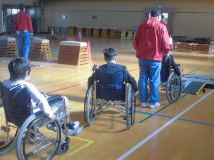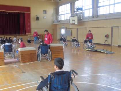 ゲストティーチャーとして大阪市立心身障がい者リハビリテーションセンターの方々に来ていただきました。4年生の子どもたちに車いすの乗り方や押し方、気をつけること、車いすに乗っている人の気持ちなどについてていねいに教えていただきました。2つの体験をしました。まずは「自走体験」…自分一人で車いすに乗って動かしてみます。次に「介助体験」…車いすを押す体験と乗って押される体験です。