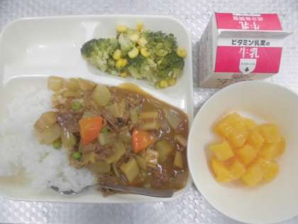 今日の給食のメニューは、冬野菜のカレーライス、ブロッコリーとコーンのサラダ、黄桃(缶)、牛乳、でした。冬野菜のカレーライスはとろみたっぷりのカレールウに牛肉とたまねぎに加えて、食べやすい大きさにカットされた大根、れんこん、にんじんが入っていました。れんこんの食感がコリコリしていて楽しめました。ブロッコリーとコーンのサラダはワインビネガーでちょっぴり酸味がありコーンの甘さも引き立っていました。黄桃(缶)は冷たくて子どもも大好きです。