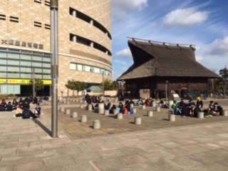 大阪歴史博物館の見学を終え、博物館前高床式倉庫がある広場で、お弁当を食べました。