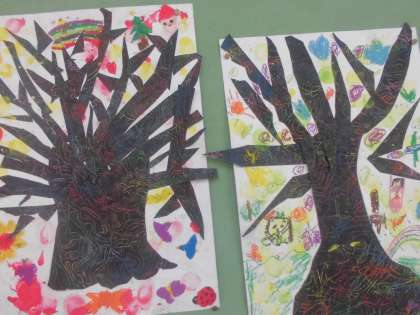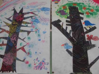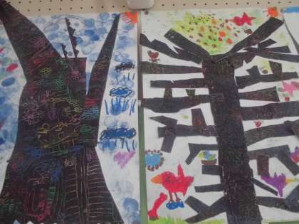 2年生の教室の後ろに絵が掲示してありました。「ふしぎな木」という題材です。写真ではわかりませんが、いろいろな技法が使われています。子どもたちが一つ一つやり方を教えてもらいながら制作したことが伝わってきました。
