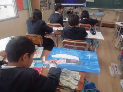 5年生が絵を描いていました。宮沢賢治の「銀河鉄道の夜」を題材にしていました。子どもたちは想像をふくらませて、宇宙に広がるきらびやかな星座や力強く走り抜けていく汽車をイメージしながら、筆を動かしていきます。絵の中に自分の思いなども込められるといいですね。