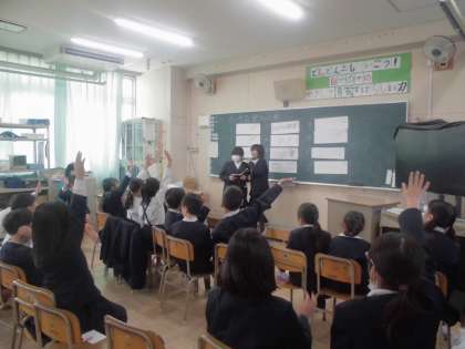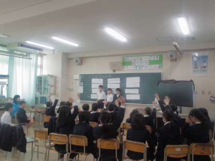 4年生の子どもたちが学級活動の時間に「お楽しみ会」をしていました。それぞれのグループが考えた出し物を順番にしていきます。いろんな種類のクイズやなぞなぞ、ものまね、ビンゴ大会、マジックの披露・・・その他にも趣向を凝らした出し物がいくつもありました。プログラムもつくって、みんなで楽しんでいました。
