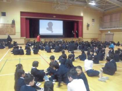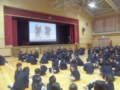 今日の児童集会は、「これはだれだ?」クイズでした。舞台のスクリーンにブラックシルエットが映し出されます。アニメのキャラクターなのですがブラックシルエットなので真っ黒です。たてわり班のメンバーで考えて解答用紙に書きます。でも低学年の子どもたちはそうはいきません。すぐに「○○だー」「△△だー」「□□だー」と口に出して答えを叫んでしまいます。素直なんですね。それでもシルエットが映し出されるたびに盛り上がっていました。