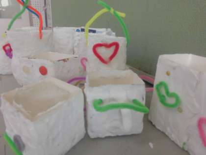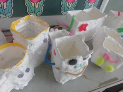 1年生がかみねんどを使って小物入れを作っていました。ペットボトルや牛乳パックにかみねんどを上手にはりつけてかわかします。あとでモールやビーズ、ボタンなどのかざりをつけていきます。するとかわいい小物入れができあがります。これはまだ完成じゃなくて、これからさらにかざりをつけていくそうです。