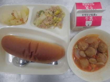 今日の給食のメニューは、ミートボールのケチャップ煮、ツナと野菜のソテー、焼きじゃが、牛乳、パン、でした。ミートボールのケチャップ煮はチキンスープをベースにケチャップの甘さと酸味が広がっていて、肉だんごがとてもやわらかかったです。野菜もたくさん入っていて、マッシュルームの食感が楽しめました。ツナと野菜のソテーはツナがキャベツ、ピーマン、コーンと一緒に炒められていました。焼きじゃがはじゃがいもがホクホクで、塩が効いていておいしかったです。