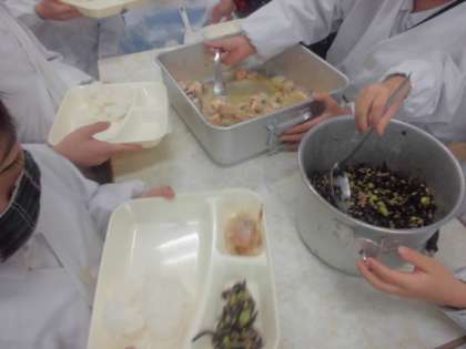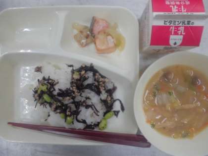 今日の給食のメニューは、栄養たっぷり枝豆のひじきご飯、さけのさわやかレモン焼き、冬野菜のみそ汁、牛乳、でした。今日の給食はいつもとちがってネーミングが凝っていますね。これは昨年度の大阪市の小学校6年生の子どもが考えた学校給食献立コンクール最優秀賞作品です。献立のねらいは「いろどりを意識して、見た目も味も食感も楽しんでもらう健康メニュー」だそうです。とてもおいしかったです。